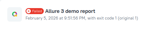 Global exit code is listed right under the report name and displays two values: the actual exit code (how the allure run process finished) and the original exit code (the exit code of the test process executed within allure run).