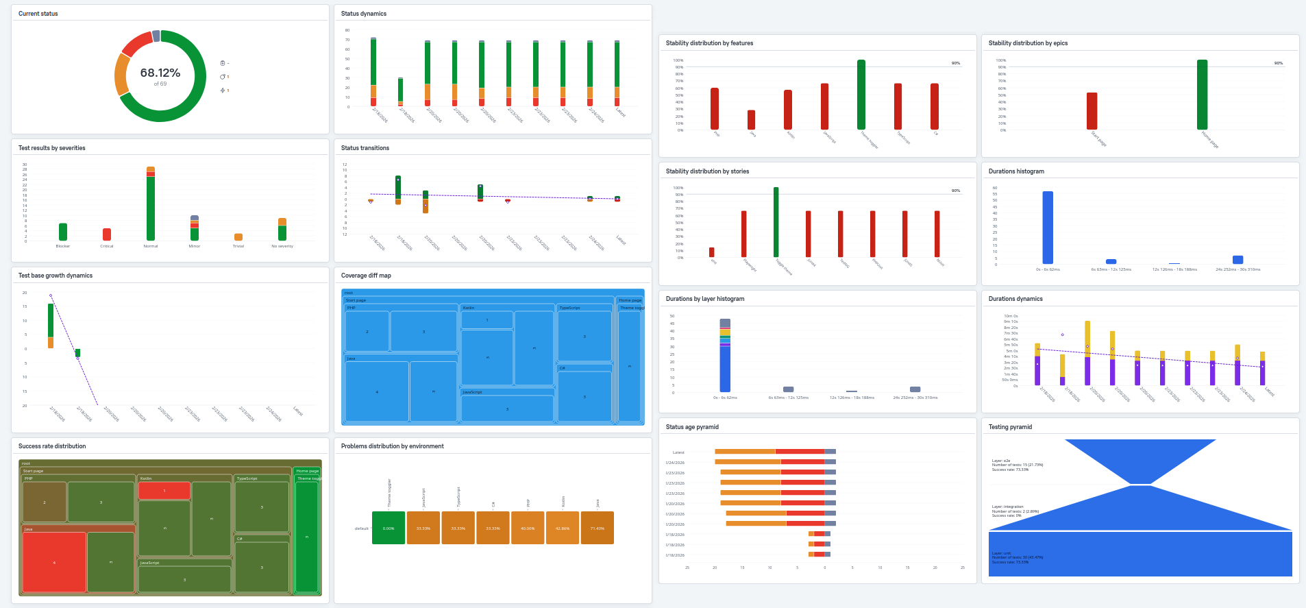 Allure Report 3 introduce muchos tipos de gráficos nuevos que ayudan a tu equipo a gestionar el proyecto y proporcionan diferentes tipos de perspectivas sobre tu suite de pruebas: instantáneas del estado actual, tendencias a lo largo del tiempo, indicadores de salud del proyecto y métricas de rendimiento.